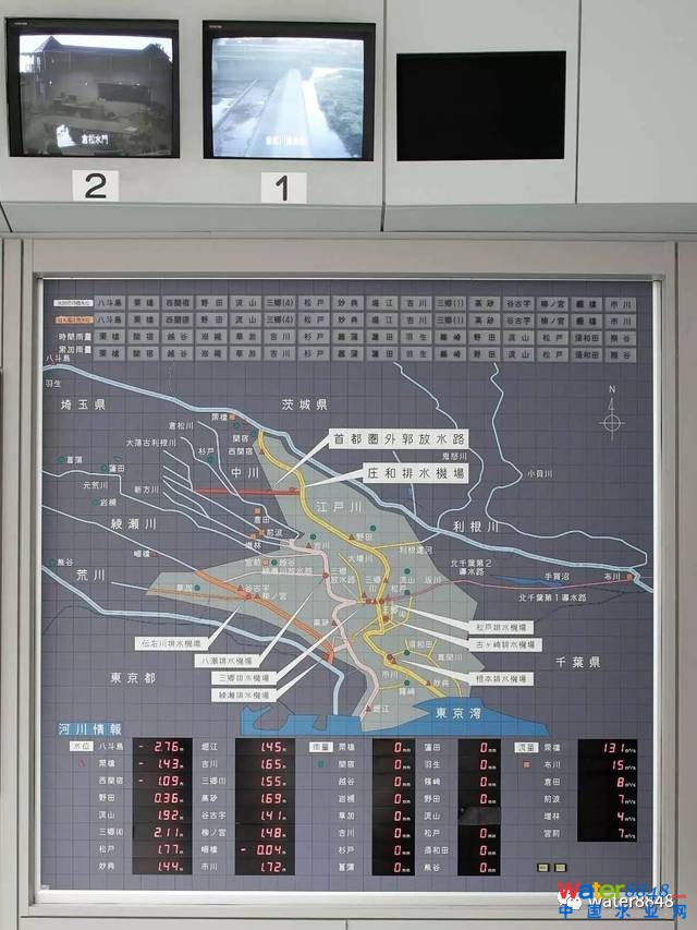 黃色的大型水泵從蓄水池中吸水,排入江戶川中。