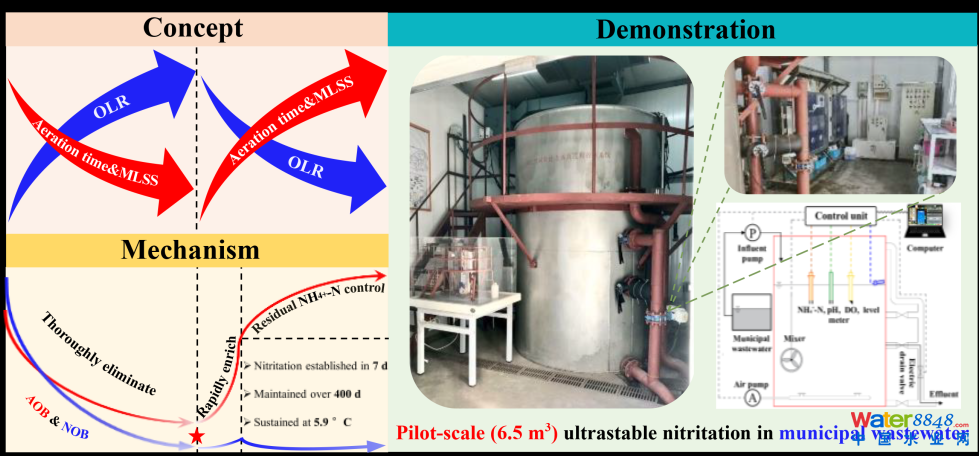 基于“新起點”概念的亞硝化策略與機理,以及坐落于北京工業(yè)大學(xué)校內(nèi)的中試現(xiàn)場圖