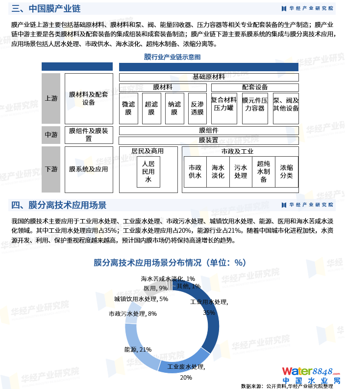 2023年中國膜行業(yè)總產值、產品結構、產業(yè)鏈及應用場景分布情況「圖」 膜產業(yè)鏈上游主要包括基礎原材料、膜材料和泵、閥、能量回收器、壓力容器等相關專業(yè)配套裝備的生產制造;膜產業(yè)鏈中游主要是各類膜材