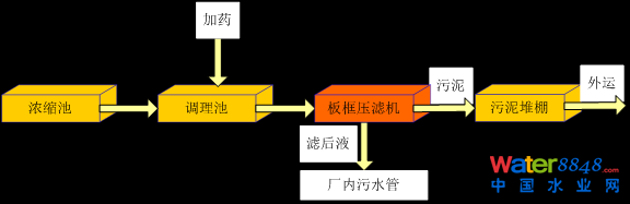 本技術(shù)通過投加專用調(diào)理藥劑對(duì)污泥進(jìn)行調(diào)理,經(jīng)過板框機(jī)壓榨后污泥含水率可降低至60%左右,實(shí)現(xiàn)了污泥的減量化和穩(wěn)定化。