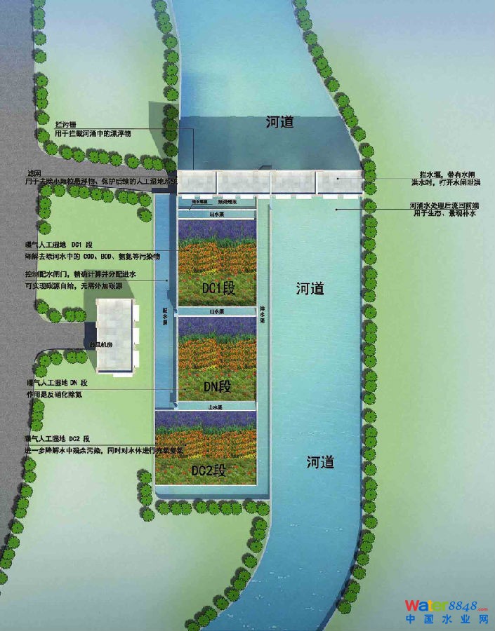 黑臭水體經(jīng)過預(yù)處理系統(tǒng)(格柵、濾網(wǎng)等),水中的大塊的漂浮物、垃圾袋被格柵攔截去除,細(xì)小的懸浮物被濾網(wǎng)攔截去除。經(jīng)過預(yù)處理后,黑臭水體先進(jìn)入曝氣濕地中的DC1段,去除污水中的COD、BOD、氨氮等污染物;再進(jìn)入DN段進(jìn)行反硝化脫氮,根據(jù)水質(zhì)情況,通過配水渠精確分配進(jìn)水水量,可以實(shí)現(xiàn)碳源自給,無需外加碳源;之后進(jìn)入DC2段曝氣復(fù)氧,最后留回前端,作為生態(tài)補(bǔ)水及景觀用水。