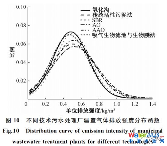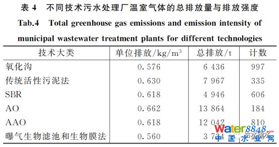 除規(guī)模外,技術(shù)也是影響溫室氣體排放強度的一個重要因素。圖10及表4給出了氧化溝、傳統(tǒng)活性污泥法、SBR、AO、AAO以及曝氣生物濾池與生物膜法六類技術(shù)的溫室氣體排放情況。通過統(tǒng)計檢驗發(fā)現(xiàn),在0.05的顯著性水平下,氧化溝與SBR、AO、AAO的溫室氣體排放強度,曝氣生物濾池和生物膜法與AO、AAO的溫室氣體排放強度均存在統(tǒng)計學(xué)上的差異。其中,氧化溝以及曝氣生物濾池和生物膜法都較AO以及AAO具有較低的排放強度。