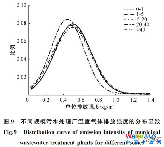 圖9及表3均給出了不同規(guī)模污水處理廠溫室氣體排放強度的差異。為了檢驗不同規(guī)模的污水處理廠在排放強度上是否存在差異,本研究進行了非參數(shù)Kolmogorov-Smirnov檢驗以及Mann-Whitney檢驗。檢驗結(jié)果表明,不同規(guī)模污水處理廠的溫室氣體排放強度不存在統(tǒng)計學(xué)上的顯著差異。但是,從均值的計算結(jié)果來看,規(guī)模越大的污水處理廠,溫室氣體排放強度越低。