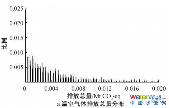 本文以2016年4 298座城鎮(zhèn)污水處理廠作為研究對象,分析廠級溫室氣體排放的情況。結(jié)果表明,2016年我國城鎮(zhèn)污水處理廠廠級溫室氣體排放總量平均為0.007 Mt CO2-eq,其中50%的廠排放總量分布在0.001 Mt CO2-eq至0.008 Mt CO2-eq之間(圖8a)。從單位水排放量來看,2016年我國城鎮(zhèn)污水處理廠廠級溫室氣體排放強度平均為0612 kg/m3,其中50%的廠排放強度分布在0.300~0.800 kg/m3(圖8b)。