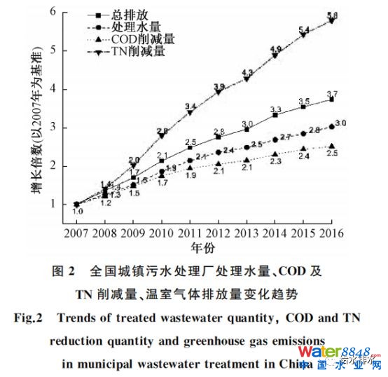 圖1是我國2007~2016年城鎮(zhèn)污水處理廠的溫室氣體排放總量。在這10年間,城鎮(zhèn)污水處理的總排放量從8.4Mt CO2-eq增長至31.4 Mt CO2-eq,增加了2.7倍。