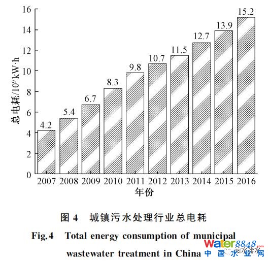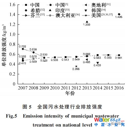 根據(jù)UNFCCC數(shù)據(jù)庫中我國最新的排放數(shù)據(jù),2012年全國溫室氣體排放總量為11 896 Mt CO2-eq,經(jīng)計算,城鎮(zhèn)污水處理行業(yè)的排放量占到了全國總排放量的0.19%。這個比例在奧地利約為0.80%,在希臘約為0.90%,在整個歐洲約為0.45%,在美國約為0.21%,在澳大利亞約為0.36%,在日本約為0.23%。我國城鎮(zhèn)污水處理廠的排放占比略低于發(fā)達國家,這可能主要和我國鋼鐵、水泥等高排放產(chǎn)業(yè)的比重較大有關(guān)。