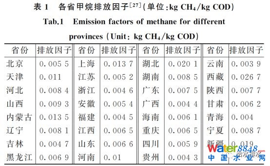 EFCH4,i——第i座污水處理廠的CH4排放因子,kg/kgCOD,不同省份的取值見表1;