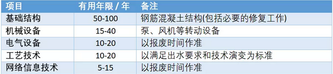 通過(guò)下表可以看出,鋼筋混凝土結(jié)構(gòu)和管網(wǎng)渠道等的壽命是可以很長(zhǎng)的,像泵、風(fēng)機(jī)等轉(zhuǎn)動(dòng)設(shè)備次之,所以設(shè)計(jì)布局的重要一點(diǎn)是要提供更具適應(yīng)力的工藝反應(yīng)池來(lái)應(yīng)對(duì)不同的目的和處理技術(shù)。