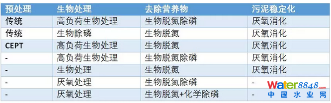 另一個(gè)選擇是主流厭氧處理,結(jié)合生物脫氮除磷或者生物脫氮+化學(xué)除磷。Daigger博士把上述的技術(shù)選擇總結(jié)為下表: