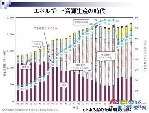 圖中紫紅色表示污泥填埋處理量。藍色圓圈表示污泥量得到有效利用的百分比。黑色塊表示污泥轉化為能源的比例。日本1988年產生的污泥量為150萬噸左右,用于農地和其他肥料的只占15%,大部分都是填埋處理。隨著下水道處理率的普及和提高,污泥產量也逐漸上升,填埋的污泥逐漸地減少。2010年污泥的有效利用率達到了78%。主要是將污泥進行焚燒,污泥灰用作水泥生產的原料。2011年由于日本福島發(fā)生了大地震,原來建在海岸邊上的很多污泥處理設施遭到了破壞,導致污泥利用率由78%驟降至55%。最近這幾年又逐漸恢復。