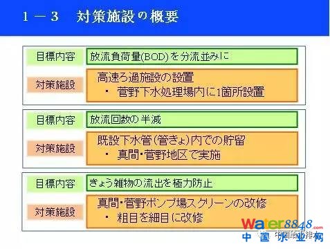 當時市川市靠東京灣邊上,調查的原因也是從油塊的發(fā)生開始的。同時也向市民明確說明了政府新的政策和法律,要求達到的新目標和改善目標要求。政府規(guī)定相關的目標有三個,市川市怎么做的,采用了什么方法都有了明確的說明。這是市川市的處理范圍,里面有污水處理廠也有供站等設施。2003年新的法律出來以后,2004年市川市自己就制定了相關的改善政策。2013年高速過濾裝置也徹底地實施完成。因為這是10年前制定的政策,后來下雨的狀況也有很大的變化。因此原來的政策措施是不是還有效,也做了相應的調整。