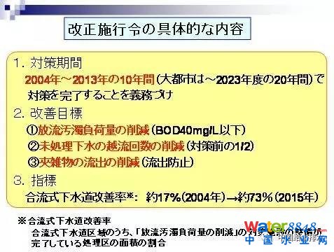 接下來就前述調查報告內容進行具體介紹。合流制下水道出現(xiàn)這樣的問題,對于從事下水道工作的人來說,心里都清楚。如果被人家指責的話,相關的下水道人都會感到很害怕。如果要改善的話,要花費大量的人力和經費。很多合流制下水道的管理者也很害怕把這個問題表面化。而且,地方政府也不積極地配合,因此政府的直營調查當時遇到了很大的困難。需要由國家的交通省直接來進行調查。日本政府為合流制的改善,制定了三個新的政策。首先是改善溢流口的結構,把溢流水面提高一些。第二個是盡量增加一些格柵,把垃圾擋在里面。還有在下雨的時候,對流出來的BOD總量進行整體的規(guī)定,不能超標。第三是對每個城市改善合流制下水道的期限做明確的規(guī)定。處理區(qū)在1500公頃以下的區(qū)域要求在2023年之前全部解決完畢,2023年大城市全部都要處理完畢。因為大的城市積重難返,問題比較多,因此需要更多的時間,需要到2023年才能改善合流制的問題。