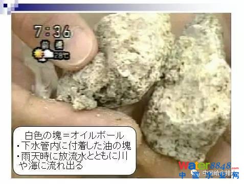 2000年左右,東京的臺廠海濱公園,在海岸的岸邊上發(fā)現(xiàn)了很多白色硬塊,在社會上引起了很大的反響。經過調查和分析,發(fā)現(xiàn)這個硬塊原來是黏附在排水管道里面的油脂硬塊所造成的,是公共管網里面排放出來的污染物。