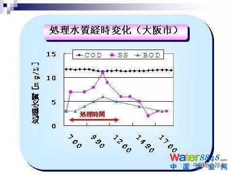 同樣,大坂市也采用雨天時活性污泥法對污水進行了處理。這是平時三倍左右的量。很明顯,污染物濃度有很大的提高,但是流出水水質沒有很大的變化。對處理水的狀況進行細分,懸浮物會有所上升,但是BOD和COD有明顯的變化。