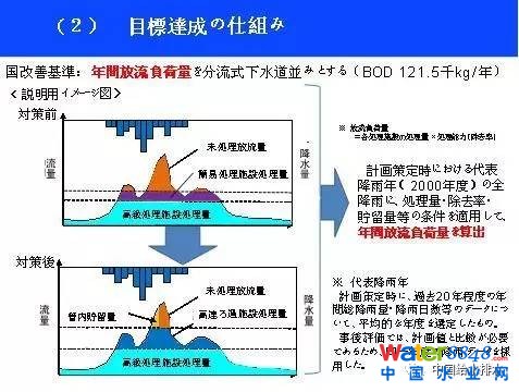 有關于第二個比較復雜,我用一個圖來跟大家做解釋。這個圖表示合流制下水道下雨的時候,B口、A口會有流水,同時污水處理廠T還會有處理水排放出來。也就是說不是對每個口子做什么規(guī)定,而是對整個河流區(qū)域雨天的排放總量進行規(guī)定。為什么呢?如果是分流制,它一年的總體排放量要求在40mg/L以下,我們根據(jù)分流制排出來的標準設定了合流制排出來的標準。也就是說把它加起來,取一個平均值進行管理。對于小城市在2004年—2013年,即10年之前給地方做了明確的規(guī)定,改善目標有三個。第一個是整體的污染物排放量要求在40mg/L以下。同時被處理水,允許溢流口排放的次數(shù)要比以前減少一半。所有的垃圾多不允許從溢流口排出來。當時,剛剛制定的時候,2004年改善了17%左右,到了2015年已有73%的溢流口得到了改善。日本的下水道由政府進行大量的資金補助,由地方政府進行來實施。2002年制定了這一政策,2007年又進行了進一步的擴展和補充。以前政府僅對大的設施建設進行補助,現(xiàn)在對小的溢流口改造,政府也出資進行補助。政府每年這方面的預算通過國會來進行資金的批準。有了政策,而且有補助金,政府又在具體技術措施方面出臺了相關的國家規(guī)范和標準。