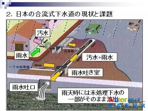 在日本大約有1500個城市,但是真正有合流制下水道的城市有191個,其中有2500萬人(約占25%的人口)是合流制下水道的區(qū)域。從面積上來看,日本國土的14%區(qū)域是合流制下水道的區(qū)域。雖然說合流制下水道有很多的問題,但是它也有很多好處。首先它的建設費用相對來說非常地便宜,它可以同時解決城市的內澇以及污染物的排放問題。但是,合流制下也有很多問題,第一個就是合流制下水道容易使得大量的污染物通過溢流口排到河道。第二個是有些傳染病的病菌通過合流制下水道能夠排到公共的水域內。第三,通過溢流口會排出大量的垃圾,影響景觀、環(huán)境。