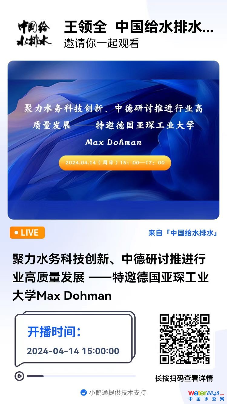 聚力水務(wù)科技創(chuàng)新、中德研討推進行業(yè)高質(zhì)量發(fā)展 ——特邀德國亞琛工業(yè)大學(xué)Max Dohman 直播時間:2024年4月14日(周日)15:00 2024-04-14 15:00:00 開始