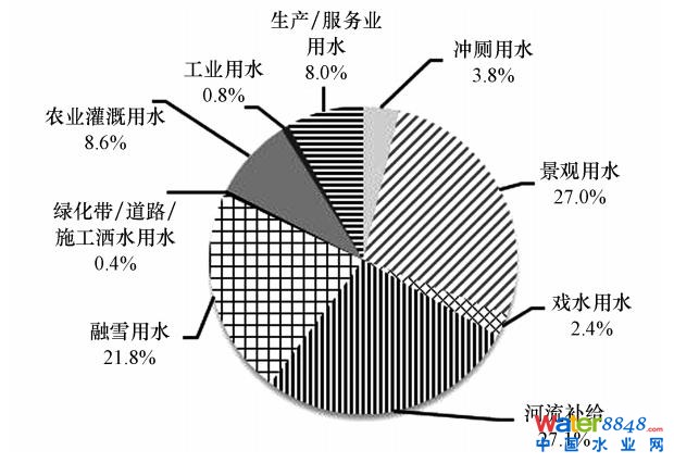 2009年日本公布的《下水道白皮書》明確了污水再生利用的重要性(張昱等,2011).據(jù)統(tǒng)計(國土交通省土地·水資源局水資源部,2013),2010年日本共有污水處理廠約2100座,年總處理量為147億m3,而再生水廠約有290座,再生水總產(chǎn)量為1.92億m3,約占總處理量的1.31%.目前日本的再生水主要用于沖廁、景觀、戲水、河流補給、融雪、綠化帶/道路/施工灑水、農(nóng)業(yè)灌溉、生產(chǎn)/服務業(yè)以及工業(yè)等(張昱等,2011; 國土交通省土地·水資源局水資源部,2013),各部分所占比例見圖 2.