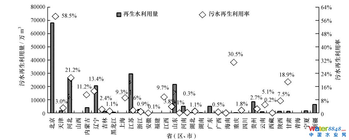 圖 3 2010年我國各省(區(qū)、市)城鎮(zhèn)污水處理再生利用量與利用率(中華人民共和國住房和城鄉(xiāng)建設部,2012)Fig. 3 Percentage and amount of water reuse in China in 2010