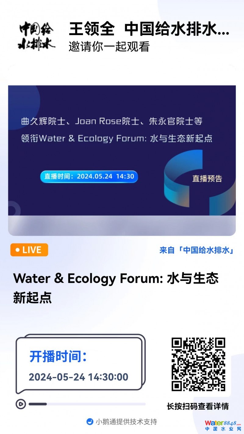 Water & Ecology Forum: 水與生態(tài)新起點(diǎn) 直播時(shí)間:2024年5月24日(周三)14:30 2024-05-24 14:30:00 開始