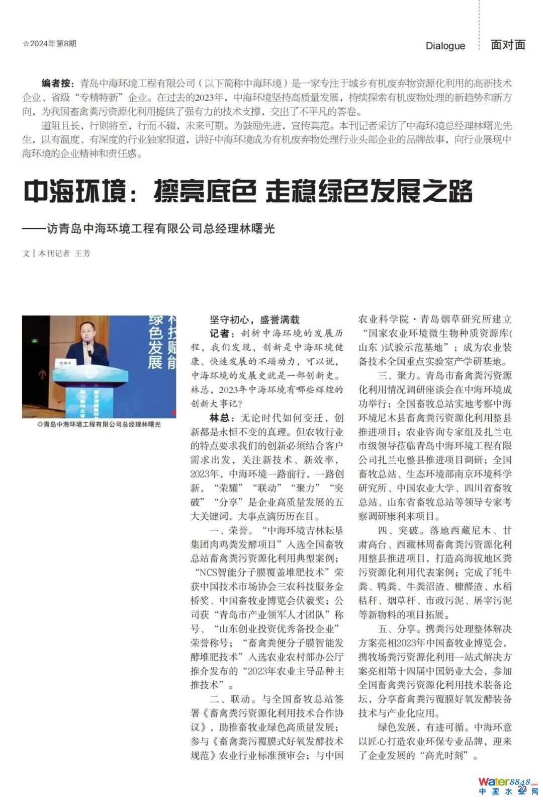 核心提示:中海環(huán)境總經(jīng)理林曙光先生接受《中國(guó)畜牧業(yè)》專訪:擦亮底色 走穩(wěn)綠色發(fā)展之路 www.dzwww.com 2023年10月7 近日,青島中海環(huán)境工程有限公司總經(jīng)理林曙光先生接受了《中國(guó)畜牧業(yè)》期刊的專訪。在采訪中,林曙光先生介紹了中海環(huán)境在有機(jī)廢棄物處理行業(yè)中的發(fā)展歷程,并講述獨(dú)特的品牌故事。 《中國(guó)畜牧業(yè)》雜志是由全國(guó)畜牧總站獨(dú)家主辦的國(guó)家級(jí)綜合指導(dǎo)類期刊。自創(chuàng)刊以來(lái),選題新奇而不失報(bào)道廣度,服務(wù)大眾而不失理論高度。頗受業(yè)界和廣大讀者的關(guān)注和好評(píng)。 青島中海環(huán)境工程有限公司(以下簡(jiǎn)稱中海環(huán)境)
