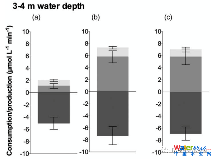 圖5. 硝化/反硝化池不同深度的氨氮凈消耗速率和硝態(tài)氮和亞硝態(tài)氮的生成速率情況。a/b/c分別指靠近、位于和遠離曝氣區(qū)的情況