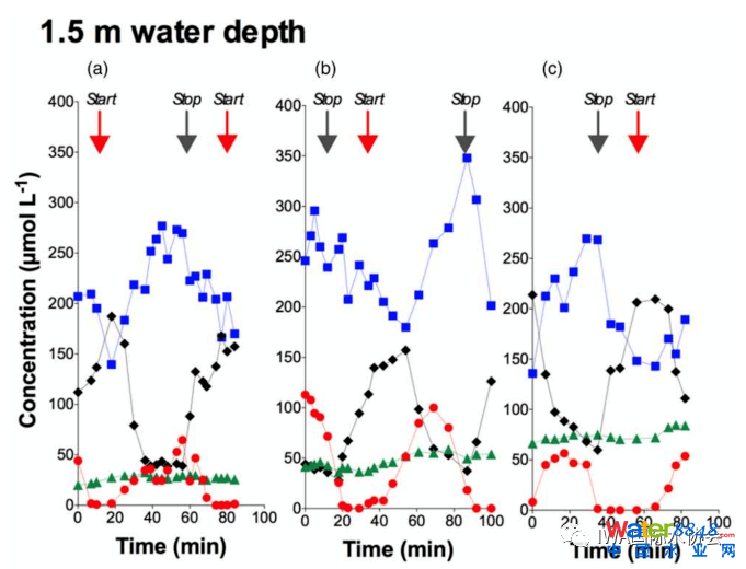 圖4.四種物質(zhì)在硝化/反硝化池的濃度的時間序列。左、右兩圖的水深分別為1.5m和3-4m;a/b/c分別指靠近、位于和遠離曝氣區(qū)的情況。