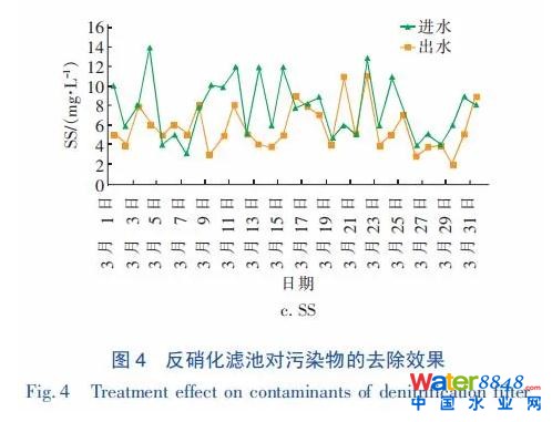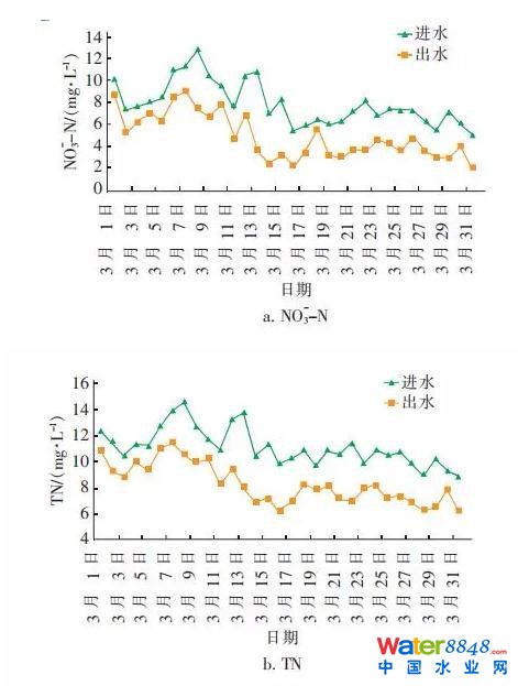 經(jīng)連續(xù)運(yùn)行,系統(tǒng)整體、各子系統(tǒng)和設(shè)備運(yùn)行正常,穩(wěn)定可靠。主要監(jiān)測項(xiàng)目有進(jìn)、出水的 COD、SS、 TP、TN、NH3 - N、NO-3 - N、NO-2 - N 等,出水水質(zhì)穩(wěn)定達(dá)到且優(yōu)于一級 A 標(biāo)準(zhǔn)。2018 年 3 月主要水質(zhì)指標(biāo)變化如圖 4 所示。