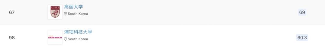 韓國(guó)有5所高校進(jìn)入世界前100。首爾大學(xué)世界排名31名,韓國(guó)科學(xué)技術(shù)院排名53名,延世大學(xué)第56名,高麗大學(xué)第67名,浦項(xiàng)科技大學(xué)第98名。