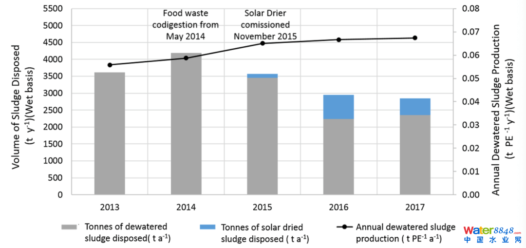 財(cái)務(wù)數(shù)據(jù)由污水廠運(yùn)行人員提供,風(fēng)機(jī)升級的節(jié)省成本是根據(jù)2016年的電價(jià)和曝氣能耗節(jié)省量來計(jì)算的。太陽能干燥器的節(jié)省成本是基于當(dāng)?shù)剡\(yùn)輸和焚燒成本計(jì)算的。協(xié)同消化的節(jié)省成本是用節(jié)省電耗減去餐廚垃圾的運(yùn)輸成本計(jì)算得到(2016年)。