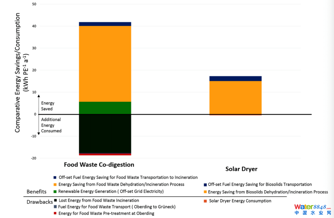 最后他們將協(xié)同消化和太陽能干化的能耗作進(jìn)一步延伸分析,結(jié)果如下圖6所示,與直接焚燒相比,厭氧消化是能耗更高效的處理食品廢物的策略。另外,太陽能干化除了節(jié)省運(yùn)輸成本,也節(jié)省了污泥焚燒時(shí)候浪費(fèi)的熱能。
