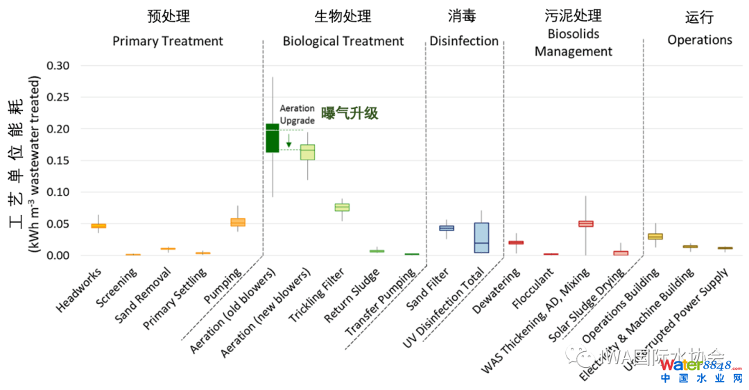 下圖2是該污水廠各細(xì)分單元的單位能耗情況。風(fēng)機(jī)升級后的曝氣單位能耗從0.20 kWh/m 3 降至0.17 kWh /m 3 (減少16%),這和供應(yīng)商承諾的改善情況接近。作者認(rèn)為Grüneck污水廠的高能耗來自預(yù)處理和泵,以及深度處理的沙濾和紫外消毒等工藝。