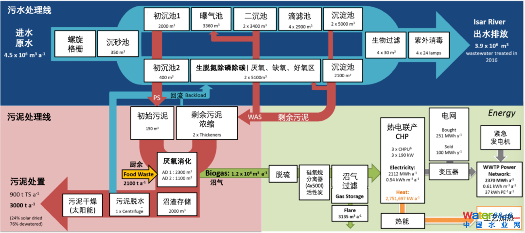 圖1.根據(jù)2016的物料平衡和能量平衡分析制作的Gruneck污水廠工藝流程圖