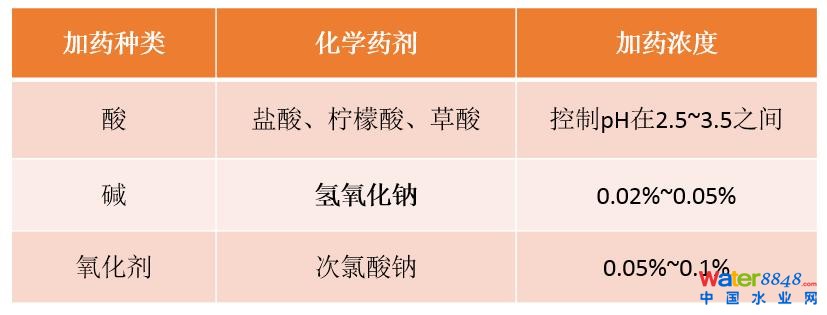 化學(xué)清洗包括維護(hù)清洗和強(qiáng)力(恢復(fù))清洗。目前常用的清洗劑有NaClO溶液,用于去除有機(jī)污染物,檸檬酸,用于去除無機(jī)污染物等。