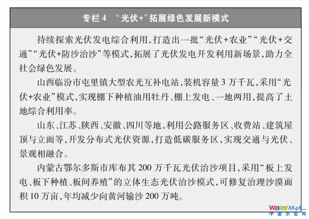 推動風電、光伏發(fā)電躍升發(fā)展。中國風能、太陽能資源豐富,風電、光伏發(fā)電成為清潔能源的主力軍。有序推進大型風電光伏基地建設,以庫布其、烏蘭布和、騰格里、巴丹吉林沙漠為重點,規(guī)劃建設4.5億千瓦大型風電光伏基地項目。推進海上風電規(guī);夯l(fā)展,累計裝機規(guī)模達3728萬千瓦。積極推進分布式新能源發(fā)展,開展“千鄉(xiāng)萬村馭風行動”“千家萬戶沐光行動”,推廣農光互補、漁光互補、牧光互補等“光伏+農業(yè)”新模式,打開了農村新能源發(fā)展的廣闊空間。截至2023年底,中國風電、光伏發(fā)電累計裝機容量分別達4.41億千瓦、6.09億千瓦,合計較10年前增長了10倍。其中,分布式光伏發(fā)電累計裝機容量超過2.5億千瓦,占光伏發(fā)電總裝機容量40%以上。