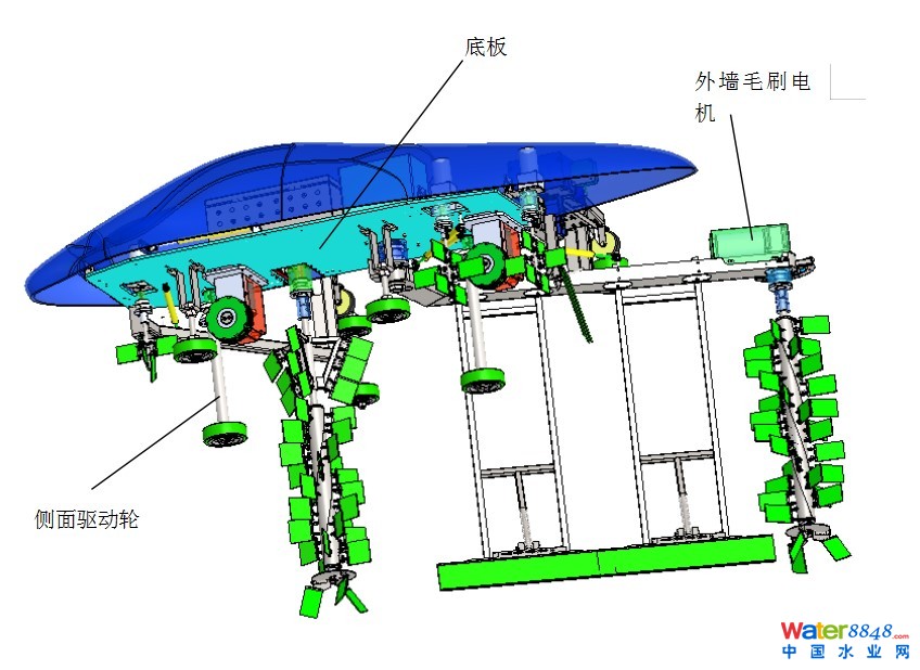 4、清洗機(jī)器人具有仿生功能,搖臂主毛刷隨輸水道外側(cè)漸開線池壁寬窄變化自動(dòng)調(diào)整,使被清洗的曲線弧面更加干凈、徹底。