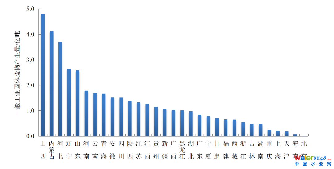 一般工業(yè)固體廢物產(chǎn)生量排名前五的地區(qū)依次為山西、內(nèi)蒙古、河北、遼寧和山東,產(chǎn)生量合計(jì)為17.9億噸,占全國(guó)一般工業(yè)固體廢物產(chǎn)生量的43.4%,見(jiàn)下圖。