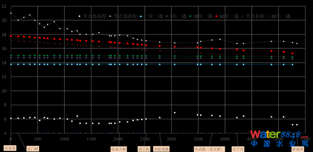通過該河流域模型,計(jì)算得出的河道工程后該河房家壩下游5.5公里不同設(shè)計(jì)降雨下各斷面的洪水水位。