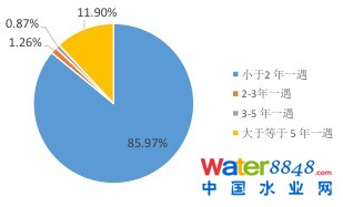模型結(jié)果表明:排水能力小于2年一遇的管網(wǎng)長度為197.3km,占總管長的百分比為85.97%;排水能力2-3年一遇的管網(wǎng)長度為2.9km,占總管長的百分比為1.26%;排水能力3-5年一遇的管網(wǎng)長度為2km,占總管長的百分比為0.86%;排水能力大于等于5年一遇的管網(wǎng)長度為27.3km,占總管長的百分比為11.9%。