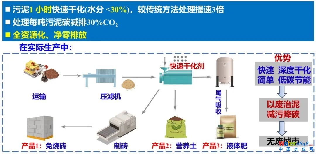這種污泥干化“神器”是如何工作的呢?據(jù)團(tuán)隊(duì)負(fù)責(zé)人、東華大學(xué)環(huán)境科學(xué)與工程學(xué)院2022級博士生孔祥海介紹,干化劑按一定比例添加到污泥中可與水分和有機(jī)質(zhì)發(fā)生反應(yīng),并快速放熱,2分鐘使污泥快速升溫至100-125攝氏度,1小時(shí)將污泥含水量從70-80%降至20-30%,重量和體積減少30%以上,產(chǎn)物可用作混凝土填料或燃料。除了快速降低污泥的含水量,污泥干化技術(shù)還能有效鈍化污泥中的重金屬(有效態(tài)重金屬降低90%以上),消除污泥中的激素、抗生素、有害菌等污染物(三害消除95%以上),實(shí)現(xiàn)同步無害化,促進(jìn)金屬廢渣危廢和污泥處理產(chǎn)業(yè)集約化、智能化、裝備化和綠色化。此外,干化后的污泥還可以制備成免燒磚和營養(yǎng)土,干化過程中產(chǎn)生的尾氣吸收后可做液體肥,實(shí)現(xiàn)資源化利用。