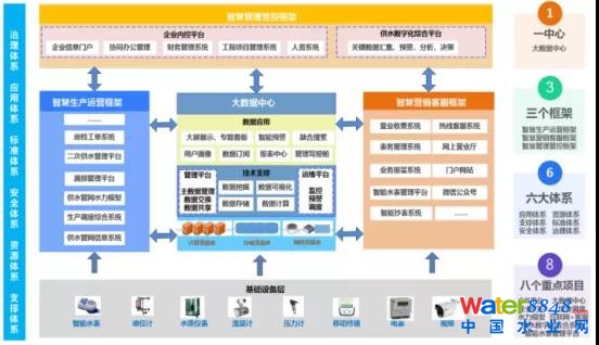 福州數字水務工作總體規(guī)劃歸納為“一、三、六、八”戰(zhàn)略:“一”是一個中心,即大數據中心;“三”是三個平臺,即“智慧生產運營平臺”、“智慧營銷客服平臺”和“智慧管理管控平臺”;“六”是六大體系,即“應用體系”、“資源體系”、“支撐體系”、“標準體系”、“安全體系”,“治理體系”;“八”是八個重點項目,即“GIS平臺”、“大數據中心”、“企業(yè)門戶”、“綜合調度”、“水力模型”、“互聯網+客服”、“智能水表管理平臺”、“供水數字化綜合系統(tǒng)”。同時福州數字水務工作遵循“五個統(tǒng)一”原則實施,即“統(tǒng)一規(guī)劃”、“統(tǒng)一標準”、“統(tǒng)一平臺”、“統(tǒng)一建設”、“統(tǒng)一管理”。