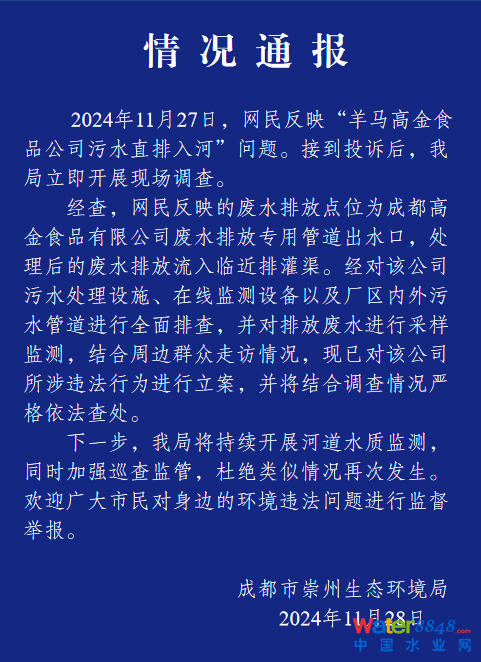 核心提示:食品公司污水直排入河?成都通報(bào):已對(duì)該公司所涉違法行為進(jìn)行立案 瀟湘晨報(bào) 2024-11-28 20:57 北京 11月28日,成都市崇州生態(tài)環(huán)境局發(fā)布情況通報(bào)。 2024年11月27日,網(wǎng)民反映“羊馬高金食品公司污水直排入河”問題。接到投訴后,我局立即開展現(xiàn)場(chǎng)調(diào)查。 經(jīng)查,網(wǎng)民反映的廢水排放點(diǎn)位為成都高金食品有限公司廢水排放專用管道出水口,處理后的廢水排放流入臨近排灌渠。經(jīng)對(duì)該公司污水處理設(shè)施、在線監(jiān)測(cè)設(shè)備以及廠區(qū)內(nèi)外污水管道進(jìn)行全面排查,并對(duì)排放廢水進(jìn)行采樣監(jiān)測(cè),結(jié)合周邊群眾走訪情況,