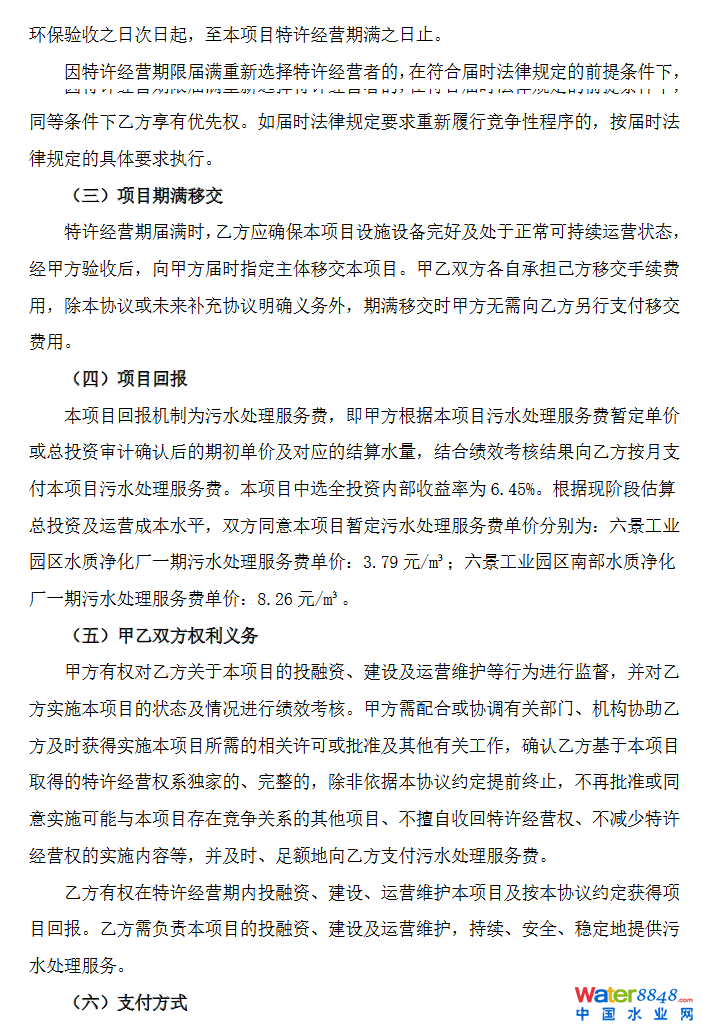 本項目回報機制為污水處理服務費,即甲方根據(jù)本項目污水處理服務費暫定單價或總投資審計確認后的期初單價及對應的結(jié)算水量,結(jié)合績效考核結(jié)果向乙方按月支付本項目污水處理服務費。本項目中選全投資內(nèi)部收益率為6.45%。根據(jù)現(xiàn)階段估算總投資及運營成本水平,雙方同意本項目暫定污水處理服務費單價分別為:六景工業(yè)園區(qū)水質(zhì)凈化廠一期污水處理服務費單價:3.79元/m³;六景工業(yè)園區(qū)南部水質(zhì)凈化廠一期污水處理服務費單價:8.26元/m³。