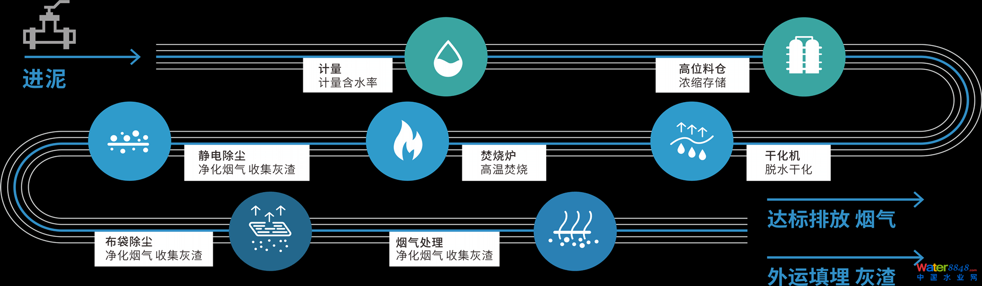 該廠主體工藝采用“半干化+焚燒”技術(shù)。是國(guó)內(nèi)首家采用該工藝的污泥焚燒廠,該工藝就地實(shí)現(xiàn)了污泥減量化、無(wú)害化和穩(wěn)定化處理。