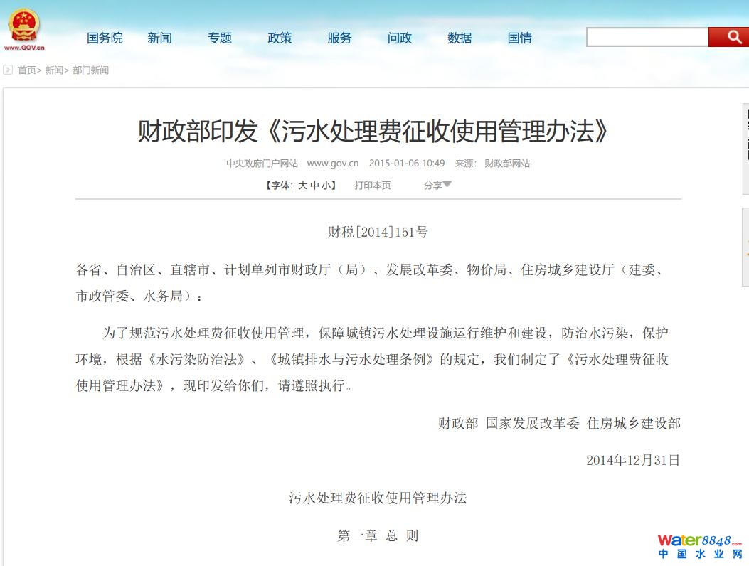 財政部、國家發(fā)展改革委和住房城鄉(xiāng)建設部聯合印發(fā)《污水處理費征收使用管理辦法》。