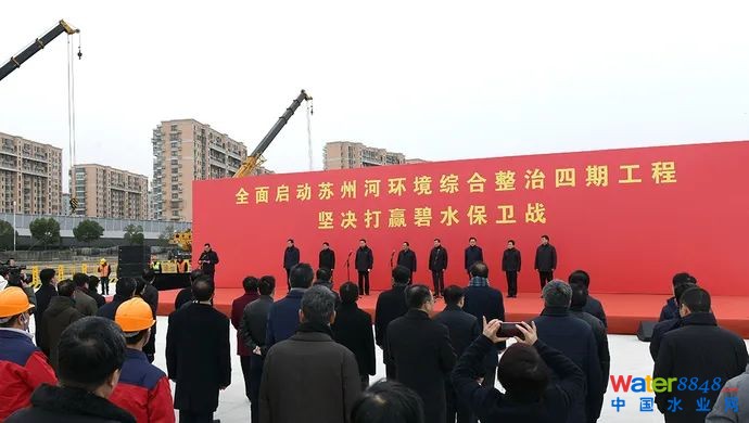 時任中共上海市委書記李強宣布蘇州河環(huán)境綜合整治四期工程全面開工,時任市長應勇講話。