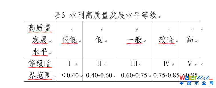 水利高質(zhì)量發(fā)展指數(shù)=∑指標(biāo)得分×權(quán)重(1)式中,水利高質(zhì)量發(fā)展指數(shù)滿分為1。同時(shí),將水利高質(zhì)量發(fā)展指數(shù)水平劃分為五級(jí),具體如表3所列。