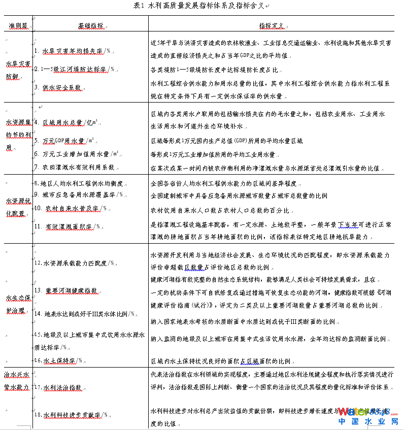 核心提示:以“節(jié)水優(yōu)先、空間均衡、系統(tǒng)治理、兩手發(fā)力”治水思路為指引 構(gòu)建水利高質(zhì)量發(fā)展指數(shù) 發(fā)布時(shí)間:2024-06-25      0 引言   黨的十八大以來,習(xí)近平總書記專門就保障國(guó)家水安全發(fā)表重要講話,并提出“節(jié)水優(yōu)先、空間均衡、系統(tǒng)治理、兩手發(fā)力”的治水思路,為做好水利工作提供了科學(xué)思想武器和行動(dòng)指南。黨的十九屆五中全會(huì)提出,“十四五”時(shí)期經(jīng)濟(jì)社會(huì)發(fā)展要以推動(dòng)高質(zhì)量發(fā)展為主題。黨的二十大報(bào)告指出,高質(zhì)量發(fā)展是全面建設(shè)社會(huì)主義現(xiàn)代化國(guó)家的首要任務(wù),是中國(guó)式現(xiàn)代化的本質(zhì)要求。水利關(guān)系國(guó)計(jì)民生,