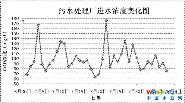 據(jù)調(diào)查,該市城區(qū)居民平均用水量為8.91/d,用水高峰期可達(dá)到近9.7/d。其排水體制以截流式合流制為主。污水處理廠以進(jìn)水早、中、晚的混合樣反映當(dāng)天污水處理廠進(jìn)水水質(zhì)基本情況。通過對該污水處理廠早中晚混合進(jìn)水COD濃度進(jìn)行監(jiān)測,得出其進(jìn)水水質(zhì)變化圖,如圖l。
