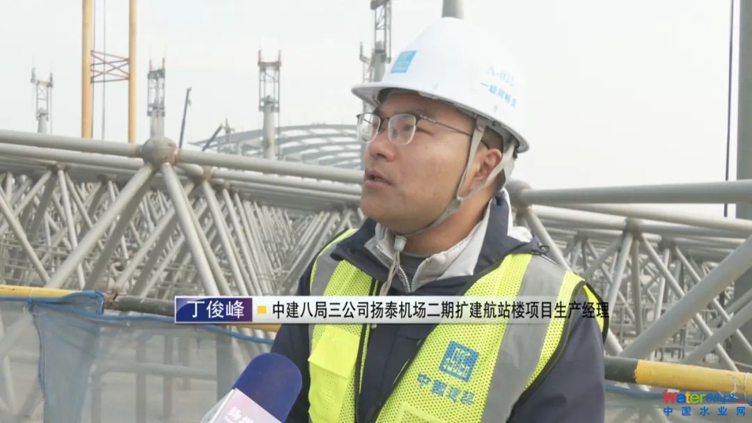 中建八局三公司揚泰機場二期擴建航站樓項目生產(chǎn)經(jīng)理 丁俊峰:預(yù)計到明年4月中下旬的時候,我們整個網(wǎng)架提升全部完成,整個機場航站樓形象給揚州市民展現(xiàn)出來。